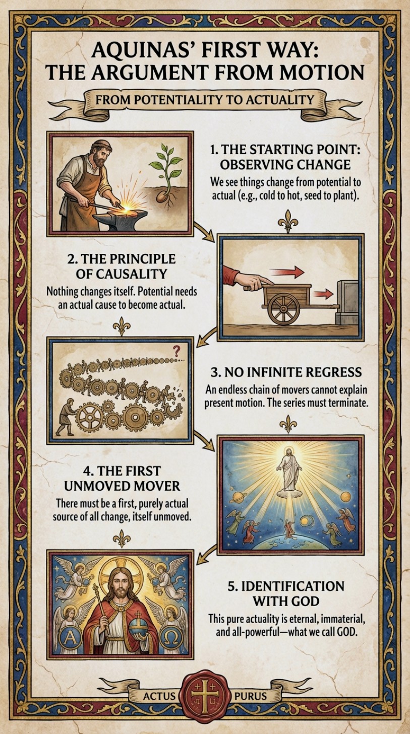 (P1) Things in the world are in motion (undergoing change). By “motion,” Aquinas means change in a broad sense (e.g., from potential to actual): local motion, growth, decay, heating, cooling, etc. Our everyday experience and all of natural science presuppose that real change occurs.