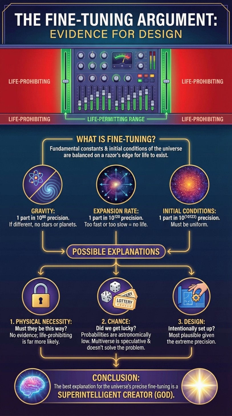 (P3) If the fine-tuning is due neither to physical necessity nor to chance, then it is due to design. (1) Design is the remaining alternative. If the fine-tuning is not due to necessity (the constants didn't have to have these values) and not due to chance (the odds are too small), then the only remaining option is design: an intelligent agent deliberately chose these values. This is a straightforward process of elimination. Unless someone can propose a fourth alternative, design is the conclusion we must draw. (2) Design is a standard form of explanation. We regularly infer intelligent design in other contexts: - Archaeologists distinguish human artifacts from natural formations. - SETI researchers would recognize an intelligent signal from space. - Forensic scientists detect the difference between accident and foul play. The key is detecting specified complexity: a highly improbable event that also conforms to an independent pattern. (3) The universe exhibits exactly this signature of design. Cosmic fine-tuning combines: - Extreme improbability (the constants could have had vastly many other values) - An independent specification (the narrow range that permits life) This is precisely what we expect from intelligent design and precisely what we don't expect from necessity or chance. (4) Design has superior explanatory power. Think about what each hypothesis predicts: - Necessity: We should expect the constants to be inevitable, but they appear contingent. - Chance: We should expect random values, which would almost certainly be life-prohibiting. - Design: We should expect values precisely calibrated for a purpose, which is exactly what we observe. Design is not just an available explanation; it's the best explanation given the data. (5) The Designer must be transcendent and powerful. What can we infer about this Designer? - Transcendent: The Designer must exist beyond the physical universe since He is determining its fundamental parameters. - Immensely powerful: The Designer can set the initial conditions and constants of the entire cosmos. - Intelligent: The Designer achieves a highly specified outcome (a life-permitting universe) that requires selecting precise values from a vast range of possibilities. These attributes point toward what classical theism has always called God. Therefore, design is the best explanation for the fine-tuning of the universe.