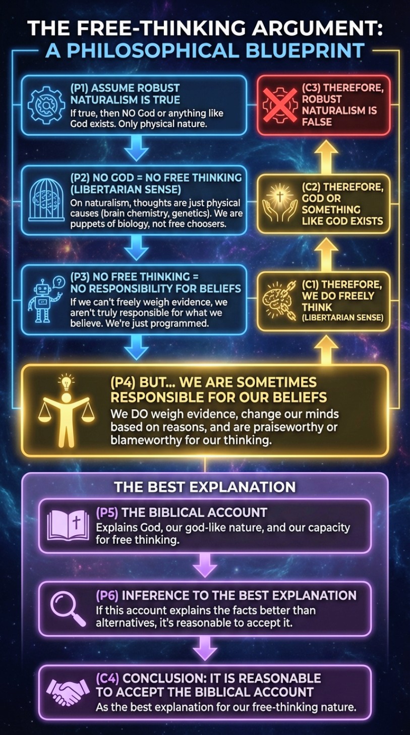 (P3) If humanity does not freely think in the libertarian sense, then humanity is never epistemically responsible. This premise argues that genuine epistemic responsibility presupposes libertarian freedom. (1) What is epistemic responsibility? Epistemic responsibility means: - Being accountable for what you believe and how you form beliefs. - Being praiseworthy when you carefully weigh evidence and avoid bias. - Being blameworthy when you ignore evidence, refuse to consider alternatives, or believe rashly. We exercise epistemic responsibility when we: - Investigate claims before accepting them. - Examine our own biases and preconceptions. - Proportion our confidence to the strength of evidence. - Follow arguments where they lead, even if the conclusion is uncomfortable. (2) Why does epistemic responsibility require libertarian freedom? Consider what must be true for genuine responsibility: First, you must have control over your beliefs: - If every belief you hold is the inevitable result of physical causes beyond your control, how are you responsible for it? - It's like holding someone responsible for their height or eye color determined by genetics and development. Think of an analogy: - Suppose a mad scientist implants an electrode in your brain. - Every time you're about to disbelieve naturalism, he triggers the electrode causing you to believe it. - Clearly you're not epistemically responsible for believing naturalism in that case. But on naturalism, all your beliefs are similarly caused by factors beyond your control: - Not a mad scientist, but genes, environment, and brain chemistry. - The only difference is the causal chain extends further back. - Either way, you lack genuine control. Second, you must be able to respond to reasons: - Epistemic responsibility involves assessing arguments and evidence. - You must be able to change your mind based on what you judge to be better reasons. - But if your beliefs are fixed by physical causes, you never genuinely "respond to reasons." Consider a specific example: - You encounter evidence against a belief you hold. - To be epistemically responsible, you must be able to: • Consider the evidence fairly. • Weigh it against evidence for your current belief. • Change your mind if the evidence warrants it. But on naturalism where determinism reigns: - Whether you consider the evidence fairly is determined by brain states. - Whether you change your mind is determined by prior causes. - You never have the power to do otherwise. So epistemic responsibility requires libertarian control over belief formation. (3) The distinction between "ought" and "is." Epistemic responsibility involves normative concepts: - "You ought to have examined the evidence more carefully." - "You should have considered alternative explanations." - "You were right to withhold judgment given insufficient data." But normative "oughts" presuppose "can": - If you literally could not have examined evidence more carefully (your brain states made it impossible), then it makes no sense to say you "ought" to have done so. - As philosophers say: "ought" implies "can." On libertarian freedom: - You could have examined evidence more carefully (genuine ability). - Therefore it makes sense to say you ought to have done so. On naturalism (assuming determinism): - You could not have done otherwise given prior physical states. - Therefore talk of "ought" collapses into mere expression of preference or social disapproval. (4) Why compatibilist freedom doesn't solve the problem. Compatibilists argue: - You're free if you act according to your strongest desires. - Even if those desires are determined, you're still "free" and can be responsible. But for epistemic responsibility, this won't work: Imagine someone who: - Desires to believe naturalism because of social pressure, fear of theism's implications, or stubbornness. - This desire was itself caused by upbringing, genes, and environment. - They "freely" (in the compatibilist sense) form beliefs according to this desire. Are they epistemically responsible? It doesn't seem so: - They never had the ability to desire differently or to override their strongest desire based on evidence. - Their belief formation was entirely a product of non-rational causes (social pressure, fear, genetics). - There's no point at which they, as rational agents, took control and chose to follow evidence over desire. Genuine epistemic responsibility requires libertarian-style control where the agent can override determined desires and follow where reason leads. (5) Implications for naturalism itself. If naturalism is true and there's no libertarian freedom: - Then naturalists aren't epistemically responsible for believing naturalism. - Their belief is just the inevitable result of brain states caused by prior factors. - There's no guarantee their belief-forming mechanisms track truth rather than survival. This connects to Alvin Plantinga's Evolutionary Argument Against Naturalism (EAAN): - Evolution selects for survival, not truth. - Our beliefs (including belief in naturalism) would be selected for fitness, not accuracy. - This gives us reason to doubt our cognitive faculties, including our belief in naturalism itself. Therefore, epistemic responsibility presupposes libertarian freedom, and without it, we lose the grounds for holding anyone (including ourselves) responsible for their beliefs.