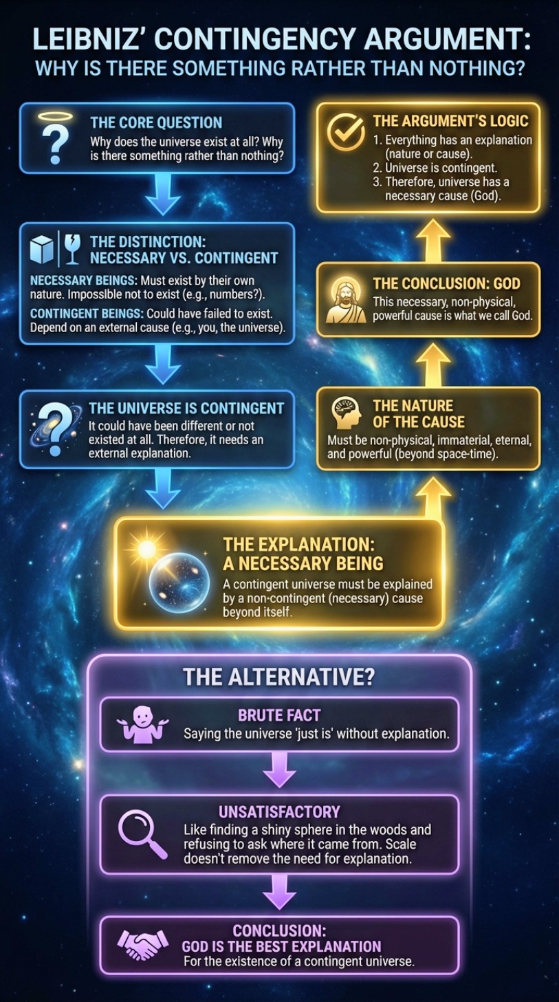 (P2) The universe is a contingent reality: it does not exist by a necessity of its own nature. (1) The universe is the totality of all physical reality. - By "universe" we mean everything physical: all space, all time, all matter, all energy, and the laws that govern them. - This includes every galaxy, every star, every particle, from the beginning of the Big Bang to the present moment and beyond. (2) We can conceive of the universe not existing or being radically different. - It seems entirely possible that there could have been no physical universe at all. We can imagine absolute nothingness: no space, no time, no matter, no energy. - We can also conceive of a universe with different laws of nature. Imagine gravity being twice as strong, or the speed of light being different, or matter not existing at all. - What can be coherently conceived as possibly non-existent or different is contingent, not necessary. (3) Scientific evidence suggests the universe began to exist with very specific conditions. - Modern cosmology indicates the universe had a beginning approximately 13.8 billion years ago. - The early universe had extremely specific initial conditions (very low entropy, precise energy distribution). - A beginning and finely calibrated initial conditions point toward contingency rather than necessity. (4) Our modal intuitions strongly favor the universe's contingency. - When we consider whether the universe had to exist, the answer seems clearly to be no. - We can imagine empty logical space containing only abstract truths but no concrete physical reality. - Nothing about quarks, electrons, or space-time geometry seems to demand: "This must exist necessarily." (5) If the universe were necessary, every feature of it would be necessary. - A truly necessary being cannot be different in any possible world. It must be exactly as it is in all possible scenarios. - But the universe appears to have countless contingent features: the number of galaxies, the precise values of physical constants, the distribution of matter. - This abundance of contingent features strongly suggests the universe as a whole is contingent. Therefore, the universe does not exist by the necessity of its own nature. It is a contingent reality that could have failed to exist.