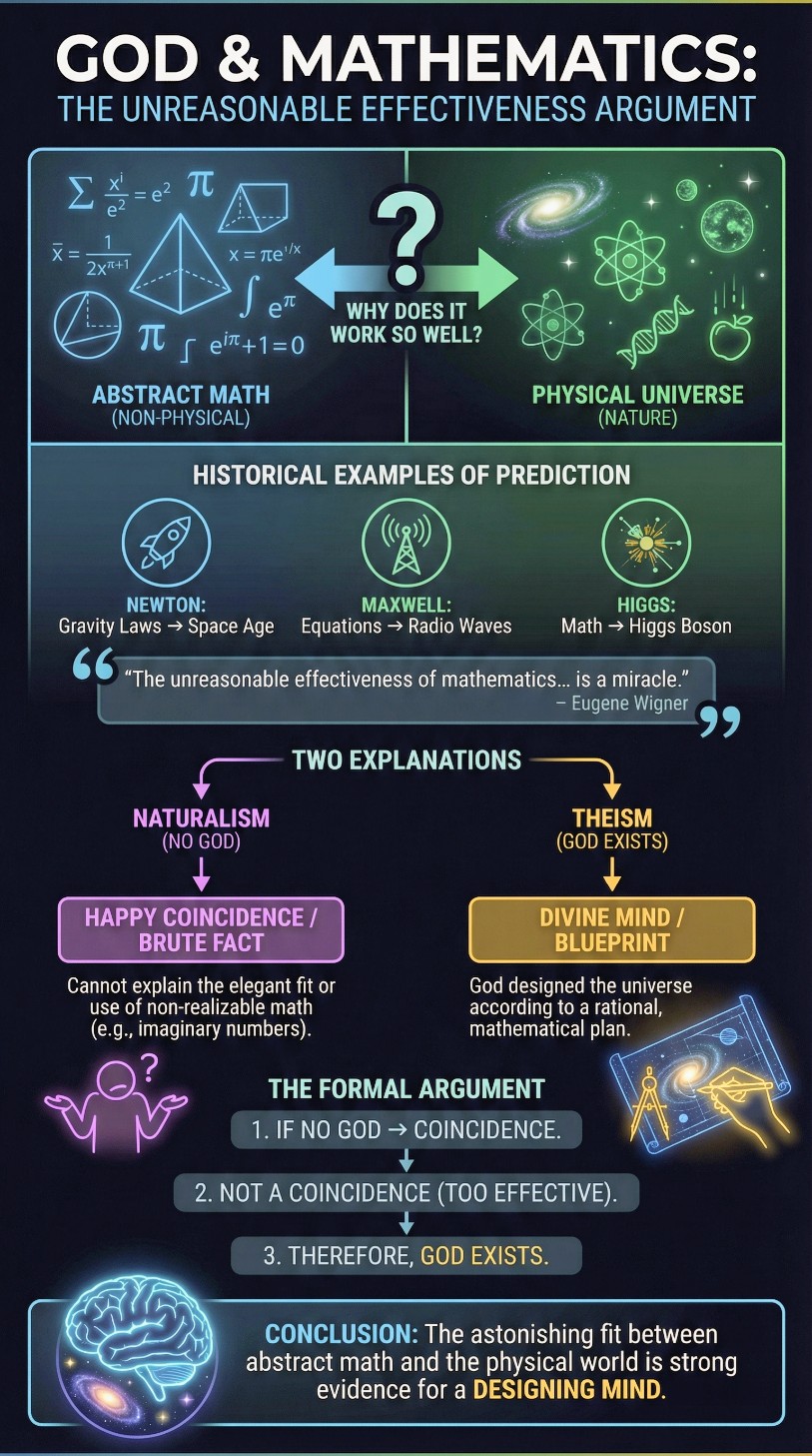 (P3) If God exists, we have a natural explanation for the applicability of mathematics. Theism provides explanatory resources that naturalism lacks. (1) God creates the physical world according to a mathematical blueprint. - When God created the universe, He designed it to exhibit a particular mathematical structure. - This structure reflects His own rational nature; God is the ultimate mathematician. - The physical world and mathematical truth share a common source in the divine mind. (2) This explains why mathematics "fits" the physical world so well. - It's not a coincidence that mathematics applies to physics; God intentionally structured the world mathematically. - Think of an architect who designs a building using blueprints. The building matches the blueprints because both come from the same source (the architect's mind). - Similarly, the physical world matches mathematical structures because both come from God. (3) This works whether we're realists or anti-realists about mathematical objects. - If mathematical objects exist as abstract entities (realism), God fashioned the physical world to instantiate their structure. - If mathematical objects are useful fictions (anti-realism), God created the world according to the mathematical blueprint He conceived. - Either way, theism explains the harmony between mathematics and physics. (4) This explains why our minds can grasp mathematics and apply it to nature. - We are created in the image of God, a rational being. - Our minds are designed to apprehend the mathematical structure God built into creation. - This explains why evolution on the African savanna produced minds capable of understanding quantum mechanics: our cognitive faculties were designed to track truth across all domains. (5) This explains the depth, elegance, and beauty of mathematical physics. - Why are the fundamental laws so simple and elegant? (Maxwell's equations, Einstein's field equations) - Why is there mathematical unity beneath apparent diversity? (electromagnetism unifies electricity and magnetism) - On theism, these features reflect God's rational and aesthetic nature. (6) Analogy: The world as God's mathematical creation. - Imagine a video game programmer who creates a virtual world governed by mathematical rules. - When characters in the game discover "the laws of physics" (the code), they're discovering the programmer's design. - The match between mathematics and physics in the game isn't surprising; it's built in by the designer. - Similarly, our discovery that nature is mathematical reflects God's design. (7) This connects to other arguments for God. - The fine-tuning argument notes that the constants in nature's equations have precisely calibrated values. - The mathematics argument asks a prior question: why are there mathematical equations at all? - Both point to a rational Mind behind the cosmos. Therefore, theism provides a natural, unified explanation for the unreasonable effectiveness of mathematics.