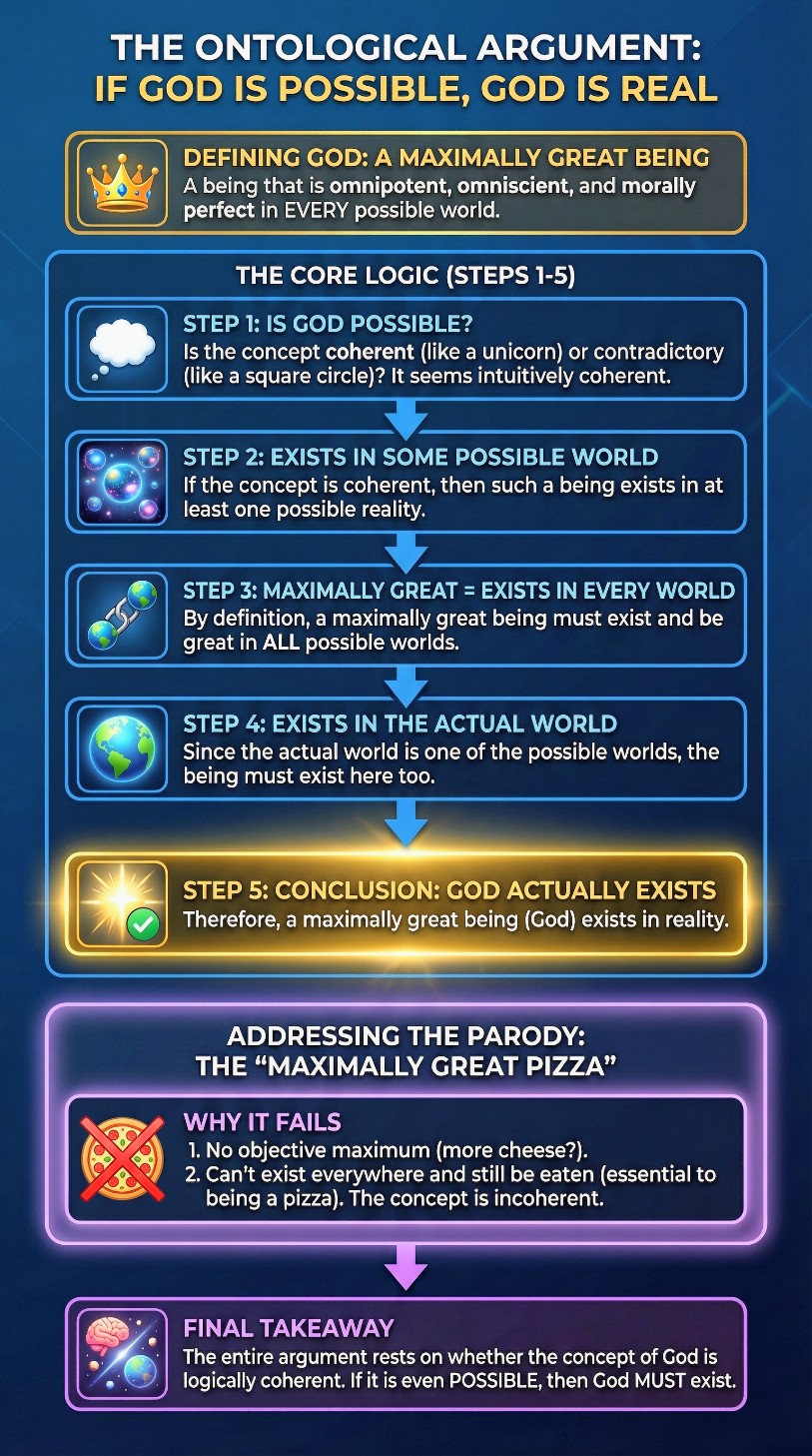 (P1) It is possible that a maximally great being exists. A "maximally great being" is one that has maximal excellence (omnipotence, omniscience, moral perfection, etc.) in every possible world. In other words, if such a being exists, it exists necessarily and cannot fail to exist. The coherence of this concept distinguishes it from parody objects like "necessarily existing pizzas" or "perfect test scores," which lack the intrinsic maxima required for necessary existence. Unlike contingent objects that could always be improved, properties like omniscience (knowing all truths) and omnipotence (having all logically possible power) represent absolute peaks that cannot be exceeded.