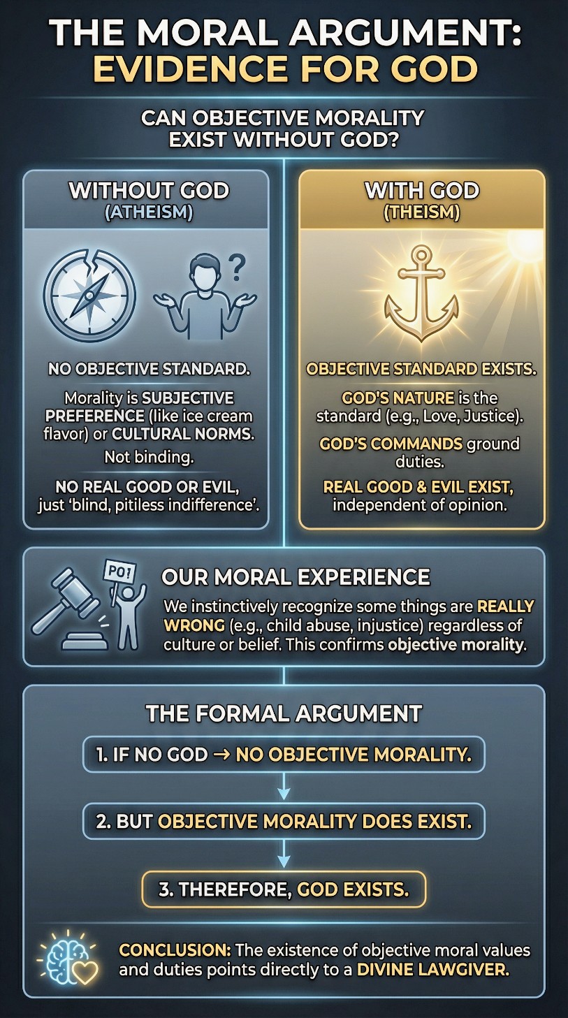 (P1) If God does not exist, objective moral values and duties do not exist. To understand this premise, we must clarify what is meant by "objective" morality and why naturalism fails to provide adequate grounding. (1) What does "objective" morality mean? When we say moral values and duties are objective, we mean: - They are true or binding independently of what any person or culture thinks. - Nazi anti-Semitism was morally wrong even though the Nazis believed it was good. - It would still be wrong even if the Nazis had won World War II and convinced everyone it was right. Think of the difference: - Subjective: "Chocolate ice cream is better than vanilla" (depends on personal taste). - Objective: "Torturing children for fun is wrong" (true regardless of anyone's opinion). (2) Distinguish between moral values and moral duties. This distinction is crucial: - Moral values concern what is good or bad (the worth of something). - Moral duties concern what is right or wrong (what we ought to do). For example: - It would be good for you to become a doctor (value). - But that doesn't mean you have a duty to become a doctor (obligation). - You could become a teacher, firefighter, or engineer, and those would also be good. Or consider: - Sometimes all available options are bad (tragic moral dilemmas like Sophie's Choice). - But you still have a duty to choose one; the badness of outcomes doesn't eliminate obligation. So values and duties are related but distinct moral categories requiring different explanations. (3) On naturalism, what is the basis for objective moral values? If atheistic naturalism is true: - Humans are accidental byproducts of nature. - We evolved relatively recently on an infinitesimal speck of dust lost in a hostile, mindless universe. - We are doomed to perish individually and collectively in a relatively short time. As Richard Dawkins put it: "There is at bottom no design, no purpose, no evil, no good, nothing but pointless indifference. We are machines for propagating DNA. It is every living object's sole reason for being." Given this picture: - Why think human beings have any special value? - Why is human well-being objectively good, any more than insect well-being or rat well-being? - What makes humans morally special compared to other animals? Philosopher Michael Ruse, an evolutionist, is honest about the implications: "The position of the modern evolutionist is that humans have an awareness of morality because such an awareness is of biological worth. Morality is a biological adaptation no less than are hands and feet and teeth. Considered as a rationally justifiable set of claims about an objective something, ethics is illusory. I appreciate that when somebody says 'Love thy neighbor as thyself,' they think they are referring above and beyond themselves. Nevertheless, such reference is truly without foundation. Morality is just an aid to survival and reproduction, and any deeper meaning is illusory." (4) The herd morality problem. On naturalism, a "herd morality" has evolved among homo sapiens through sociobiological pressures: - Cooperative behavior aids survival. - Self-sacrifice within groups helps the group survive. - Certain taboos develop because they're advantageous. But this gives us no reason to think this morality is objectively true: - If evolutionary history had gone differently, very different creatures with very different values might have evolved. - By what right do we regard our evolved morality as objectively correct rather than theirs? - To insist humans are morally special is "species-ism" (unjustified bias toward one's own species). Consider rape as an example: - It may not be socially advantageous, so it became taboo in human evolution. - But that does absolutely nothing to show rape is really, objectively wrong. - Rape occurs constantly in the animal kingdom with no moral significance. - On naturalism, humans are just animals, and animals have no moral obligations. (5) On naturalism, what is the basis for objective moral duties? Moral duties involve obligation: we ought to do some things and ought not do others. But obligation requires a personal source. Philosopher Richard Taylor explains: "A duty is something that is owed. But something can be owed only to some person or persons. There can be no such thing as duty in isolation. The idea of political or legal obligation is clear enough... Similarly, our moral obligations can be understood as those that are imposed by God. But what if this higher-than-human lawgiver is no longer taken into account? Does the concept of a moral obligation still make sense? The concept of moral obligation is unintelligible apart from the idea of God. The words remain but their meaning is gone." Think about it: - Legal duties are owed to the state or fellow citizens. - Contractual duties are owed to the parties in the contract. - Parental duties are owed to one's children. But on naturalism, to whom are moral duties owed? Who or what imposes these obligations on us? - Not society (morality transcends social convention). - Not evolution (blind natural processes don't create genuine obligations). - Not ourselves (we can't obligate ourselves to what conflicts with self-interest). (6) The theistic alternative provides natural grounding. On theism: - Moral values are rooted in God's perfectly good nature. - God is essentially loving, just, kind, generous, faithful, impartial. - His nature is what Plato called "the Good," the standard by which all else is measured. - Moral duties are rooted in God's commands. - These commands flow necessarily from His nature, so they're not arbitrary. - They constitute our obligations as God's creatures. Think of the two great commandments: - "Love the Lord your God with all your heart, soul, mind, and strength." - "Love your neighbor as yourself." On this foundation: - Love, generosity, self-sacrifice, justice, and equality are objectively good. - Hatred, selfishness, cruelty, oppression, an